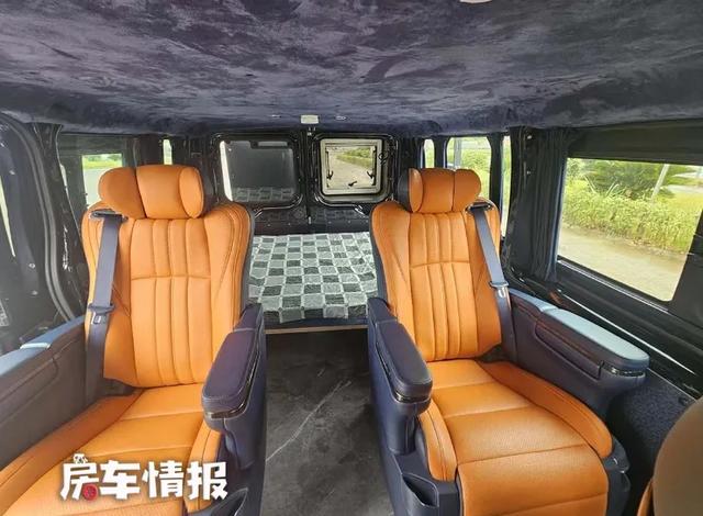而这款车的后部设计也挺出乎我的意料之外,或许车主是为了照顾日常代步使用,这款车后方生活区的设计可以说是非常简单,后排简单粗暴地设置了两张独立航空座椅,车内顶棚进行了反毛皮包覆,整体还真有点商务车的感觉。