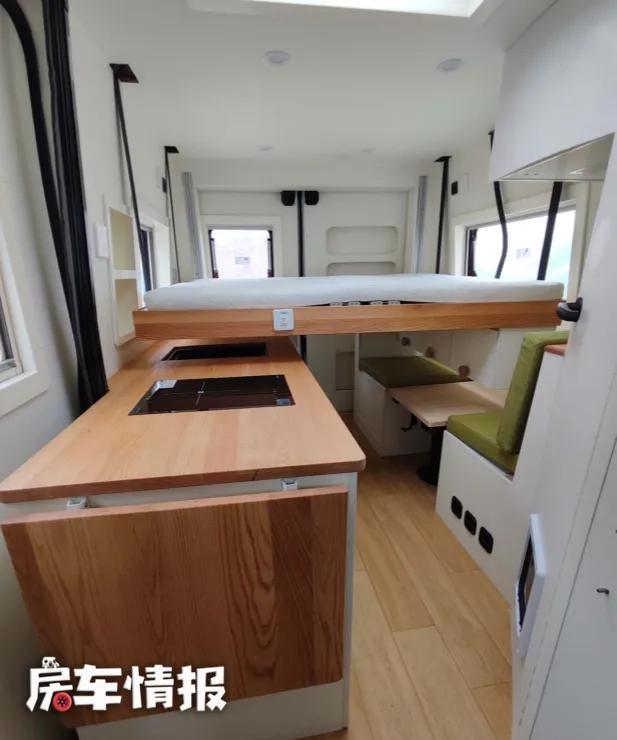 车尾部则是一张横置床铺,可以提供两个人的休息区,位于前方也提供了一个尺寸不是很大的厨房操作区域,可以实现基本的操作。