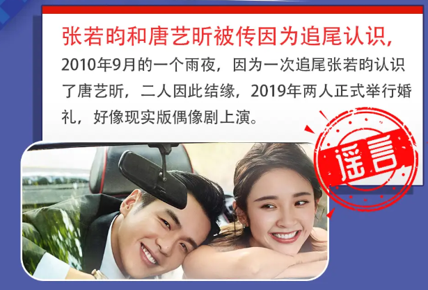 【第一现场】本月五大经典谣言解剖1. 唐艺昕张若昀"追尾爱情"破灭记谣言版本:两人因交通事故相识,上演现实版《命中注定我爱你》