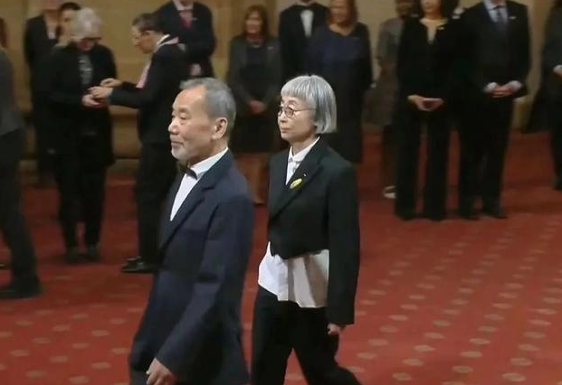 在外国皇室接见这种一本正经的场面下,村上春树还是那副社恐模样,有些战战兢兢。相比起来,反倒是妻子强大的气场在背后支撑着他。
