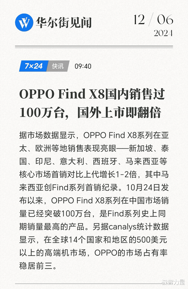 OPPO Find X8系列在10月底发布以来,仅用一个多月的时间,就实现了国内销售过100万台,国外多个市场首销比上代增长1~2倍的亮眼成绩。在14个国家和地区的500美元以上高端机市场,OPPO已经稳居前三。