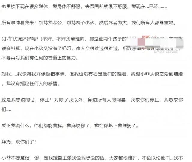 她只是不断地恳求大家停止网暴,给她和汪小菲一个安静的空间。
