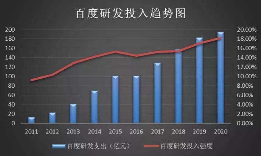 自2011年以来,百度在研发上的投入始终保持着高速增长。从全年总营收的145.01亿元中拨出20亿元用于研发开始,百度就已经奠定了行业领先地位。到了2020年末,百度首次将研发占比提升至20%以上,并连续8个季度保持这一高水平。