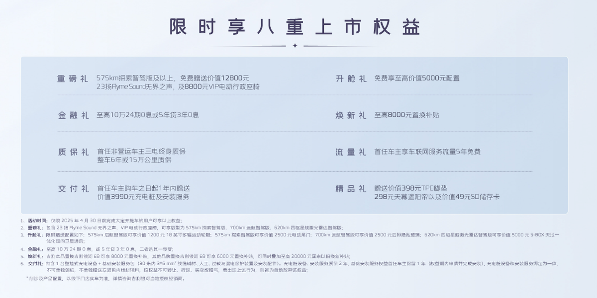 2025款银河E8用“降价增配”诠释性价比:限时售价14.98-19.88万元,较老款门槛直降1.6万元,700km续航版本杀入17.88万元区间,比同级竞品低3.7万元。用户4月30日前购车还可享价值2.16万元的23扬声器音响、VIP电动行政座椅及至高8000元置换补贴哦!