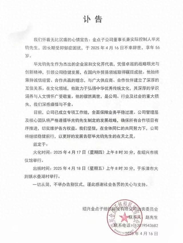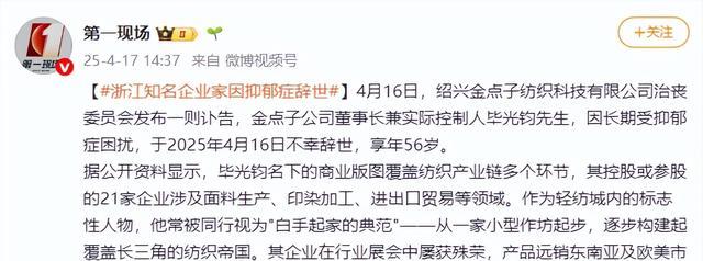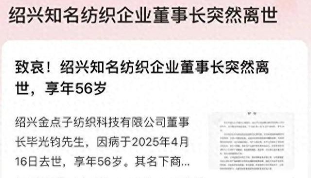 极目新闻2025-04-17——致哀!绍兴知名纺织企业董事长突然离世,享年56岁