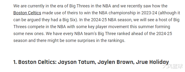 如今想要在NBA夺得总冠军,三巨头阵容就是标配。就比如上赛季凯尔特人凭借三巨头阵容赢得了总冠军,又比如去年的掘金也是凭借三巨头赢得了总冠军。那么问题来了,新赛季最好的三巨头阵容是哪一组?针对这个问题著名体育媒体FW给出了我们答案。遗憾地是詹姆斯、戴维斯、拉赛尔的三巨头阵容并没能进入前五。下面我们来一起看看FW给出的是一份什么样的名单吧。