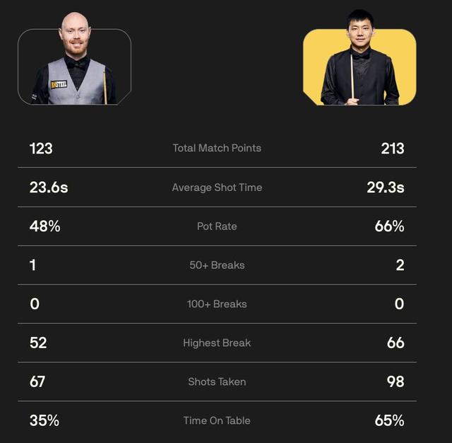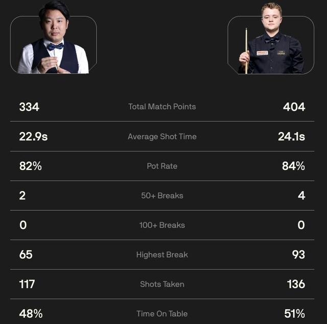 比赛首局,双方陷入激烈的缠斗。在频繁的攻防转换中,龙泽煌凭借多次精准的上手,以68-50的比分先下一城;第二局龙泽煌状态神勇,轰出单杆66分,以72-10的比分零封对手;第三局加里-威尔逊打出单杆52分后进攻终止,龙泽煌回敬单杆52分,胶着纠缠中,加里-威尔逊以73-52的比分扳回一局。