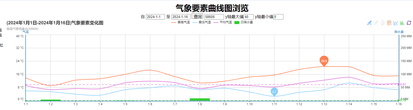 2024年1月1日以来,我市晴多雨少,气温逐渐回升。1月1~16日,我市平均气温9℃,较常年同期偏高3.1℃,第四高位。三九以来(9~16日)我市平均气温9.9℃,较历史同期偏高4.4℃,为南昌气象史上第三温暖的三九!降水方面,平均降水量为12.1毫米,较常年同期偏少67.6%。日照时数87小时,较历史同期偏多1.09倍。