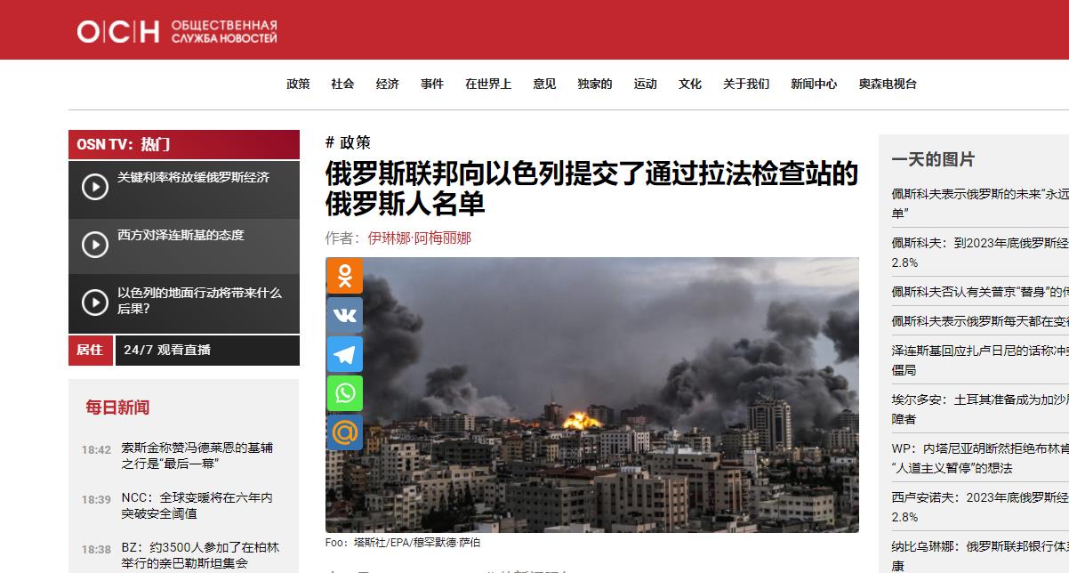 俄罗斯公共新闻网11月3日报道,俄罗斯外交部副部长博格丹诺夫11月3日就俄罗斯人通过拉法检查站离开加沙地带的可能性,和以色列进行了谈判,他表示,俄罗斯希望以色列尽快批准俄罗斯外交部提交的俄罗斯公民名单,让俄罗斯公民人能够通过拉法检查站撤离加沙。