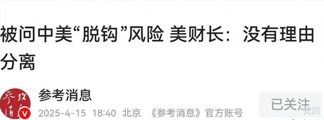 美国财政部长贝森特14日在接受采访时被问及中美两国经济“脱钩”的风险时表示,美国和中国经济没有理由分离,两国之间有可能达成“一项重大协议”。