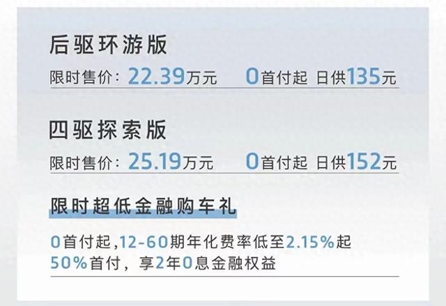 动力上搭载了由1.5T增程器和电机组成的增程式混动系统,提供后驱和四驱,系统最大功率分别为200kW和360kW,系统峰值扭矩分别为410N·m和720N·m,均匹配容量为43kWh的全新琥珀电池,CLTC纯电续航里程分别为318km和259km,综合续航里程分别为1458km和1357km。