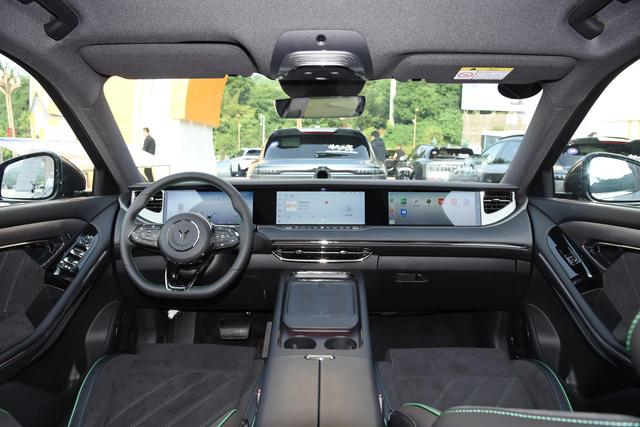 内饰中控台配备了可升降一体式三联屏,整体长度为1066mm,可根据驾驶模式调整屏幕高度。方向盘和座椅使用仿生麂皮材质搭配绿色缝线,还在细节处融入了大量碳纤维饰板的点缀。车机内集成了全新一代智能座舱,支持华为HiCar手机互联;并针对语音管家进行了优化升级,支持四音区声源定位,提供连续性语音识别、可见即可说、手势控制功能以及多指飞屏操控等功能。副驾驶娱乐屏拥有爱奇艺、腾讯爱趣听、喜马拉雅、K歌、无线投屏等众多娱乐功能。新车还搭载了最新的百度apollo领航辅助智驾2.0系统,提升了日常驾驶的安全属性。