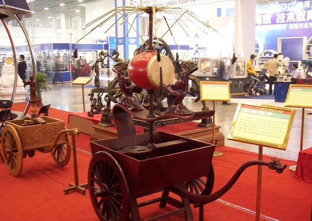 这个三国时期的机械大师马钧的发明,也叫司南车,整车都是机械结构,车顶的小人并不是因为磁性转动指南,而是利用了齿轮的“差速器”原理。小人和车轮之间通过齿轮连接,每个车轮运动都可以带动小人转动。