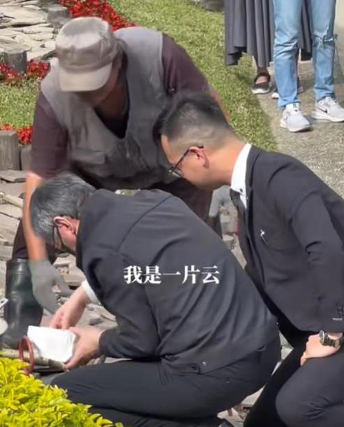 琼瑶的儿子陈中维手捧琼瑶的骨灰花葬,当时他是全身颤抖着走到花葬位置,工作人员搀扶着他进行落葬。