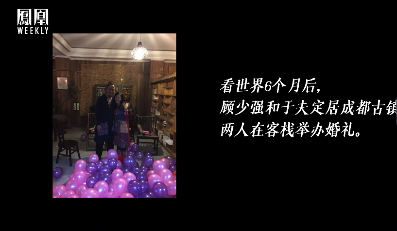 2015年顾少强辞职后,仅仅6个月,顾少强就跟丈夫于夫在成都古镇结婚,随后定居,还创办了一个客栈。