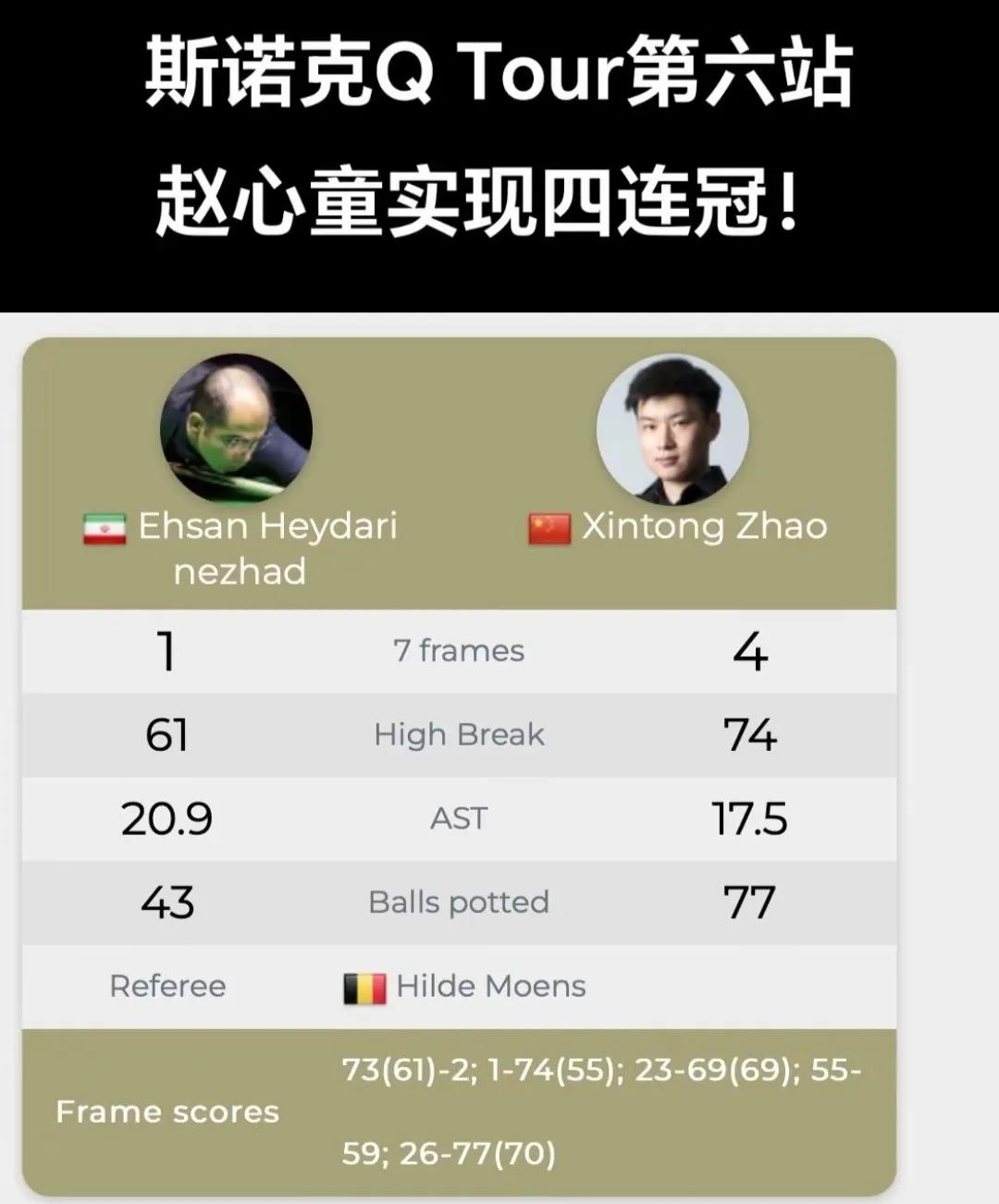 2025年1月13日凌晨,欧洲Q Tour第六站比利时站的比赛结束了,赵心童以4-1逆转对手,完成4连鞭,冠军又是被赵心童拿了。