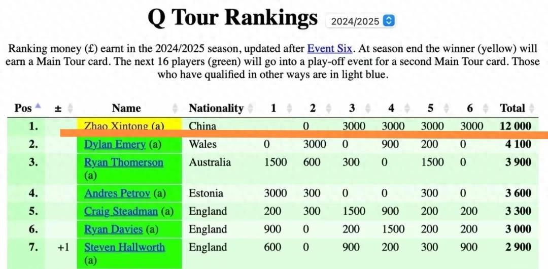本站结束,赵心童:欧洲Q Tour4连冠,32连胜,积分12000分。