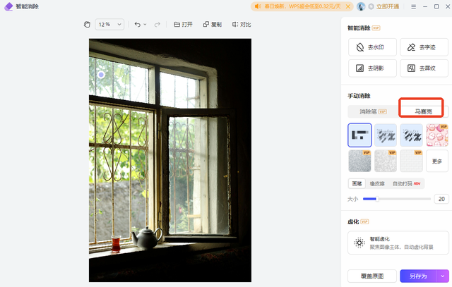 分为智能消除和手动消除,在“手动消除”模块有展示“马赛克”功能,选中模板后可手动调整画笔大小,识别到信息还能自动打码,等处理好后就能保存了。