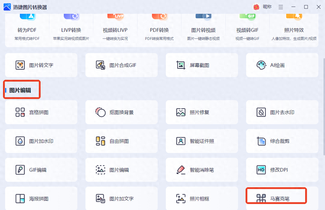 打开后在“图片编辑”模块就能找到需要用到的【马赛克笔】了,支持添加多种格式的图片文件,一次选择一张,提供基础和图案马赛克这两种类型可选。