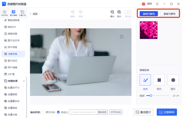点击进入【马赛克笔】后先添加单张图片,有预设多种马赛克样式可选,然后选择画笔形状并调整大小,拖动鼠标就能开启涂抹,满意的话还支持去水印保存。