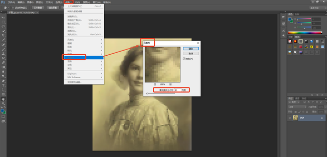 先选择单张图片导入,再点击顶部的“滤镜”菜单,在下拉列表找到并选择 “像素化”中的 “马赛克”,调整单元格大小就能打马赛克了,最后按下“确定”。