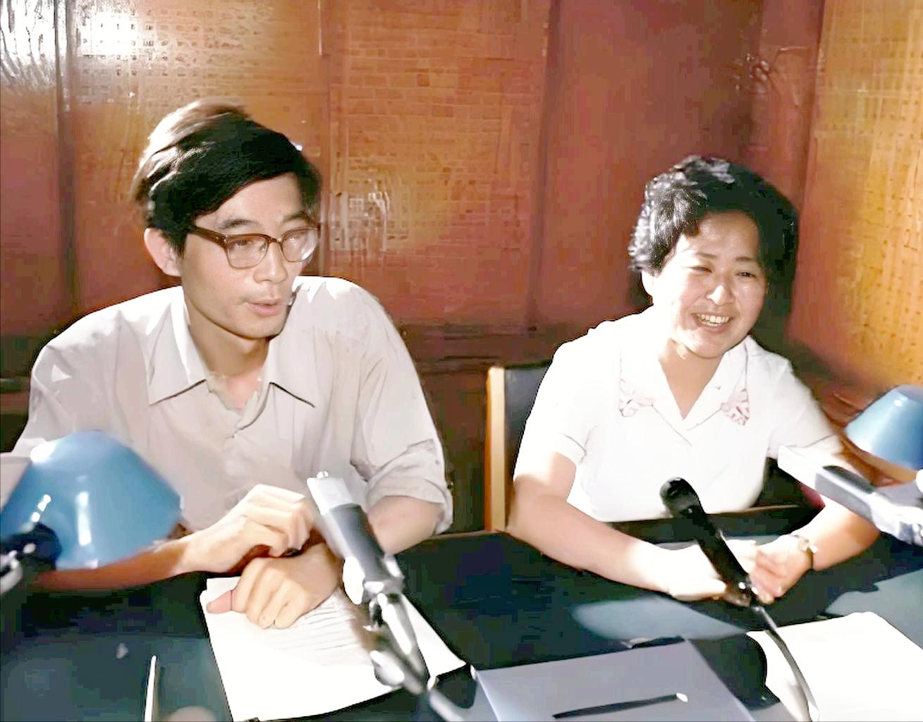(中央人民广播电台主持人虹云、傅成励正在录制《午间半小时》节目)