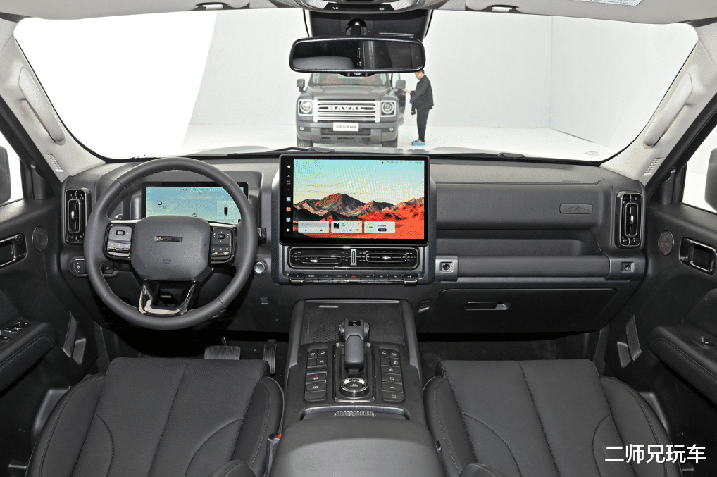 新车内饰布局兼具机械感与科技感,搭载大尺寸中控屏,同时还保留大量物理按键,副驾前方则加装了越野车上常见的拉手。