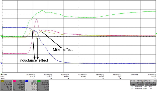 我们用图4的波形来说明门极产生的寄生电压现象。仿真在半桥电路下进行,其中绿色的第4通道,红色的第2通道以及蓝色的第3通道分别是开通IGBT的门极电压、IC电流以及VCE电压。而黄色的第1通道是同一桥臂上对管的门极电压,可以看到有两个正向的包和一个负向的坑。其中第1个包和第1个坑就是由于发射极的电感引起的,在时序正好对应了两次电流的变化。而第2个包则是由dvCE/dt带来的寄生影响,可以通过米勒钳位来抑制,也可以用关断负压解决。但对于前两个尖峰,用米勒钳位效可能会使峰值更高。图5(a)和(b)分别是无米勒钳位和有米勒钳位的波形,从橘色的波形表现来看,用米勒钳位对解决米勒导通非常有效,但对寄生电感引起的门极电压尖峰则效果不佳。特别是第2个向下的峰值很重要,我们接着分析。