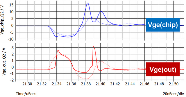 那加上米勒钳位功能后效果怎么样呢?请参考图8,实线是用了miller功能的,虚线是没有用miller功能的,峰值更大,增加了寄生导通的风险。看来米勒钳位无法解决di/dt引起的寄生导通问题。这种情况下,只能仰仗负压关断,或者增大Rg来放慢di/dt了。