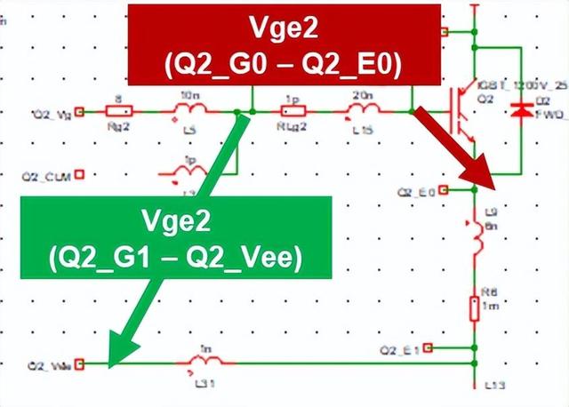 由于受模块内部发射极绑定线的影响,上面的测量都是在外部端子上的,内部G、E上到底如何呢?我们将借助仿真来展现。图6和图7分别是仿真电路测试点和测得的内部电压波形。可以看见内部门极电容上的电压和外部测得的刚好是相反的。之前那个向下的尖峰才是真正会带来门极电压提高的关键!