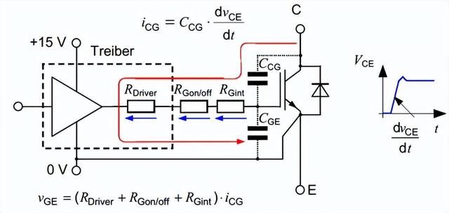 IGBT是一个受门极电压控制开关的器件,只有门极电压超过阈值才能开通。工作时常被看成一个高速开关,在实际使用中会产生很高的电压变化dv/dt和电流变化di/dt。电压变化Dv/dt通过米勒电容CCG电容产生分布电流灌入门极,使门极电压抬升,可能导致原本处于关断状态的IGBT开通,如图1所示。电流变化di/dt可以通过发射极和驱动回路共用的电感产生电压,影响门极,如图2。