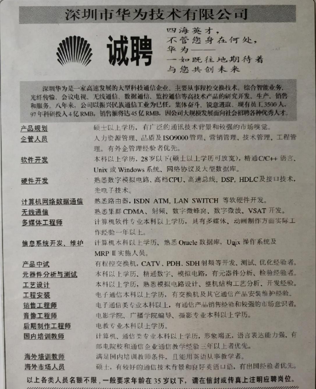这是一张1996年的招聘,从产品规划,到后期制作,包罗万象,最后一行更是说明:人员名额不限。