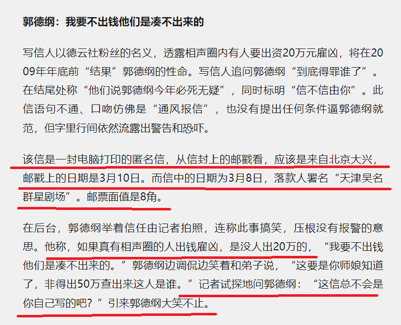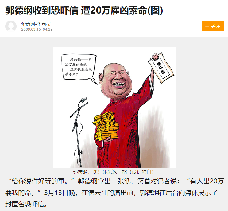 刷到一篇文章,标题是《郭德纲人身安全遭到威胁,被出价二十万买命,他到底得罪了谁?》