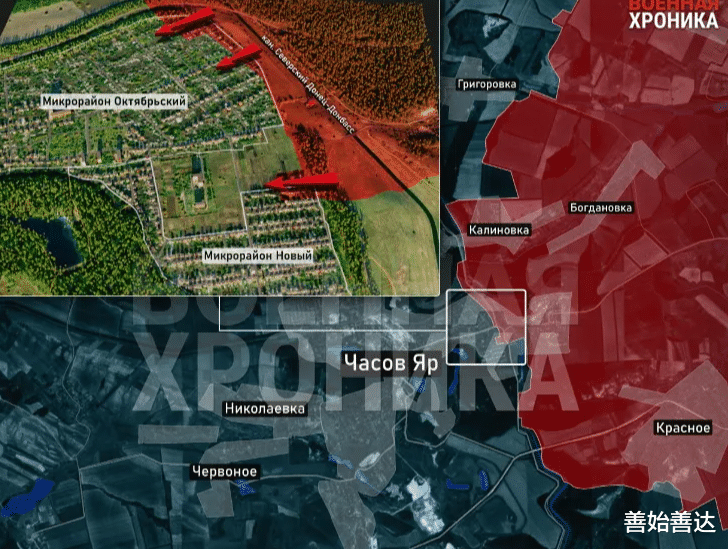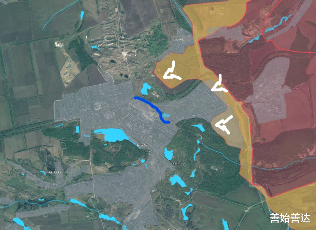 乌军可能会撤到耐火厂(下图蓝线)。虽然撤退还没有发生,但俄军如打到那里将意味着恰镇战斗的真正结束,因为再没有其它合适的地方可建立坚固防线。