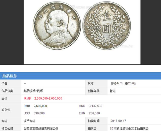 2007年,在北京的诚轩拍卖会上,一枚签字版民国三年袁世凯像壹圆L.GIORGI的袁大头,以235.2万元成交,目前该版本仅存9枚,十分稀有