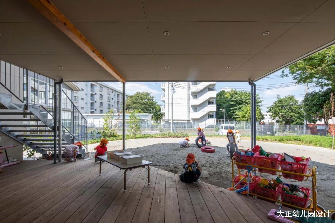 除了建筑主体,设计师在托儿所的户外环境设计方面也下了一番功夫。不同于大多数致力于硬化地面,保持地面平整的幼儿园,该托儿所除了户外绿化,还保留了一大片原生态的沙土地面。