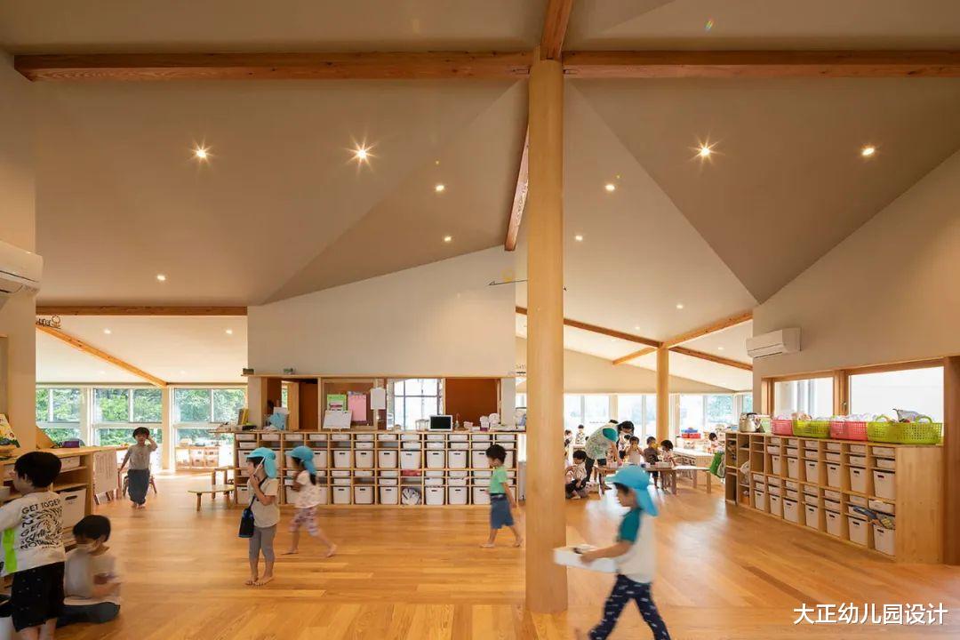 托儿所室内的主要装潢也是以原木为主,随处可见的木质地板、储物柜、支撑原柱,以及散布在天花板上星星点点的灯光共同组成了一个温馨、明亮和轻盈的生活空间。