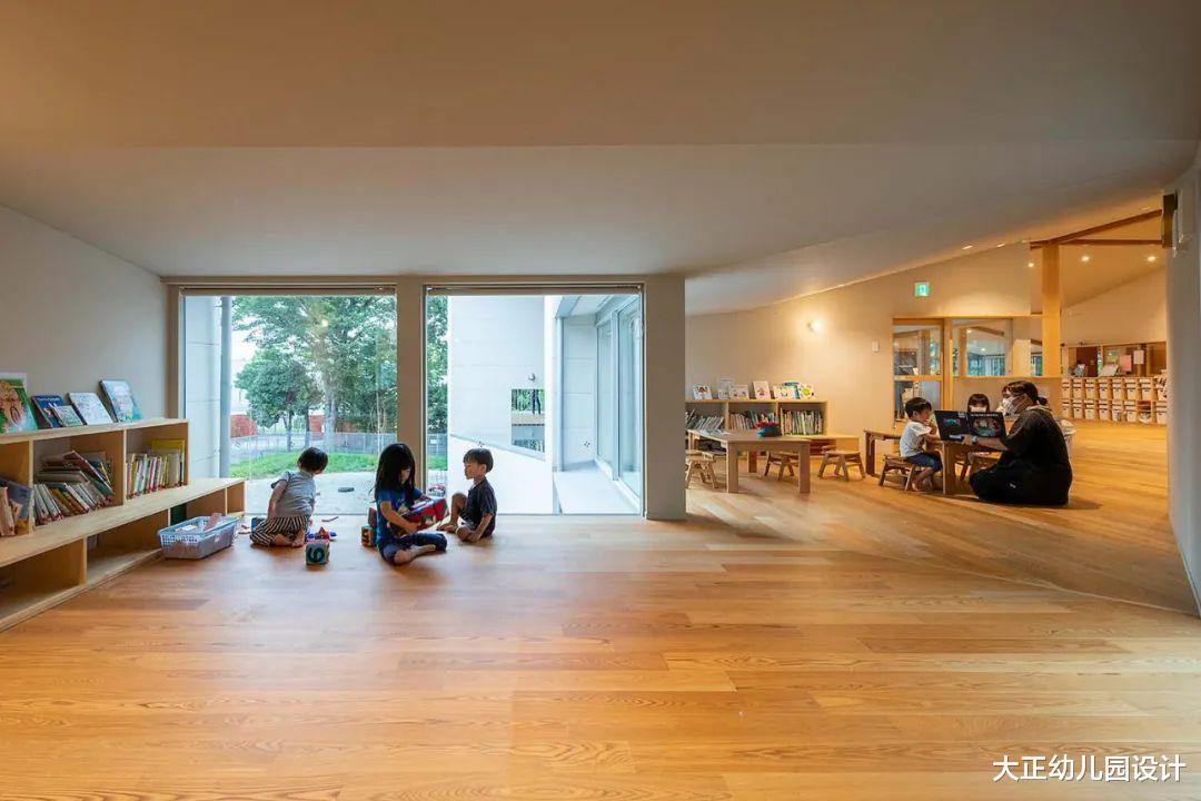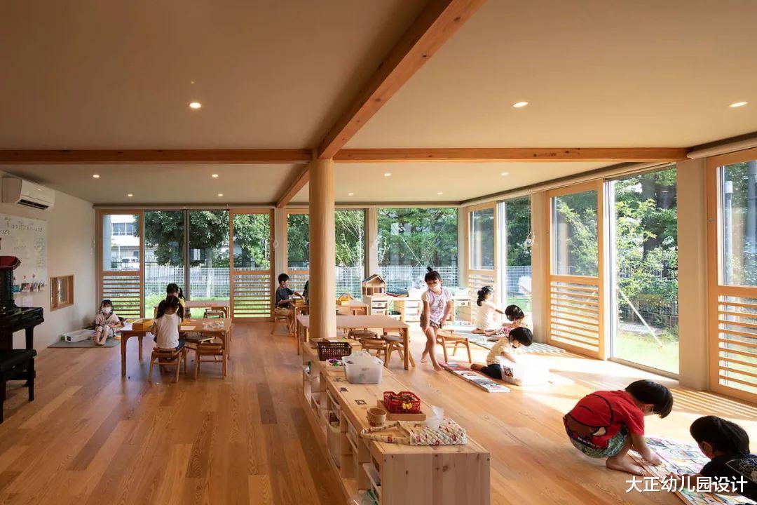 除此之外该托儿所为木制结构建筑,运用玻璃为墙面对于支撑结构的负担更小,更符合建筑整体的受力结构。