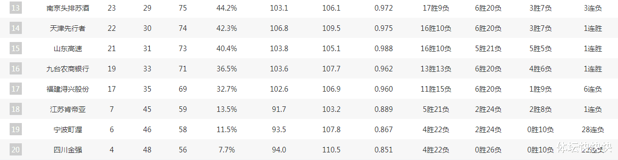 而在没进季后赛的球队排名依次是:13南京、14天津、15山东、16吉林、17福建、18江苏、19宁波、20四川。