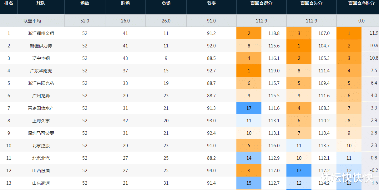 进攻效率(百回合得分)前5的球队分别是:广东(119)、浙江(118.8)、山西(117)、辽宁(116.1)、北控(116)。
