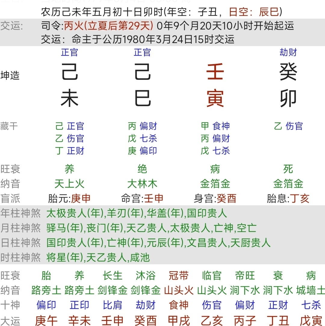 许鸿林回复:坤造,年柱己未、月柱己巳、日柱壬寅、时柱癸卯。壬水日主生于巳月为绝地,整个地支都是泄耗日主能量的五行,天干又有两个官星克日主,只有时干癸水帮身,地支中无根又无金生水弱,日主身弱至极属于弃命从财格,喜克泄耗不喜生扶,用神是金水,忌神木火土。