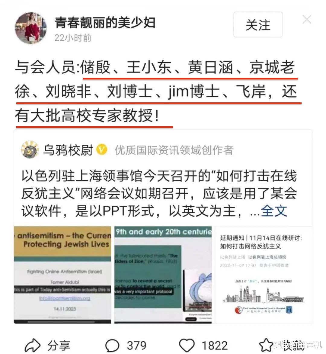 为什么退网?只是因为一条未经证实的消息,用飞岸老师的话说是造谣,大概是说她跟储殷、王小东、张晓菲、黄日涵、老徐等等一些网络大V去上海以色列领事馆参加会议。