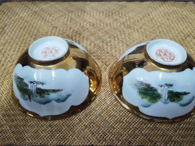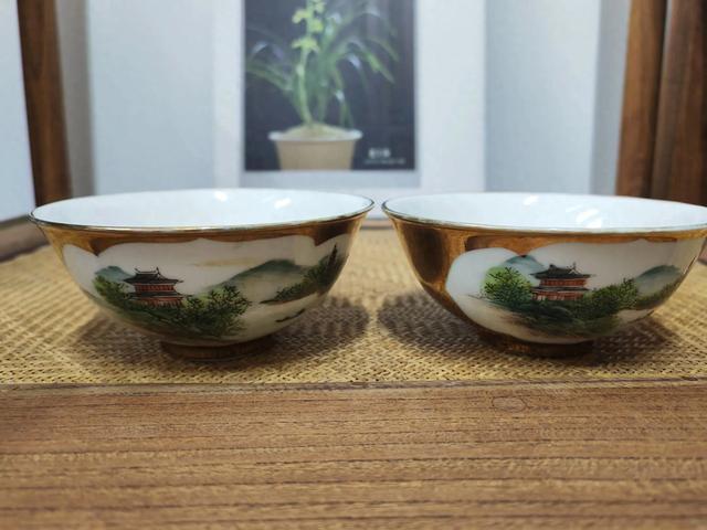 这是一对五十年代,江西景德镇出品,金地开窗粉彩青绿山水小碗。