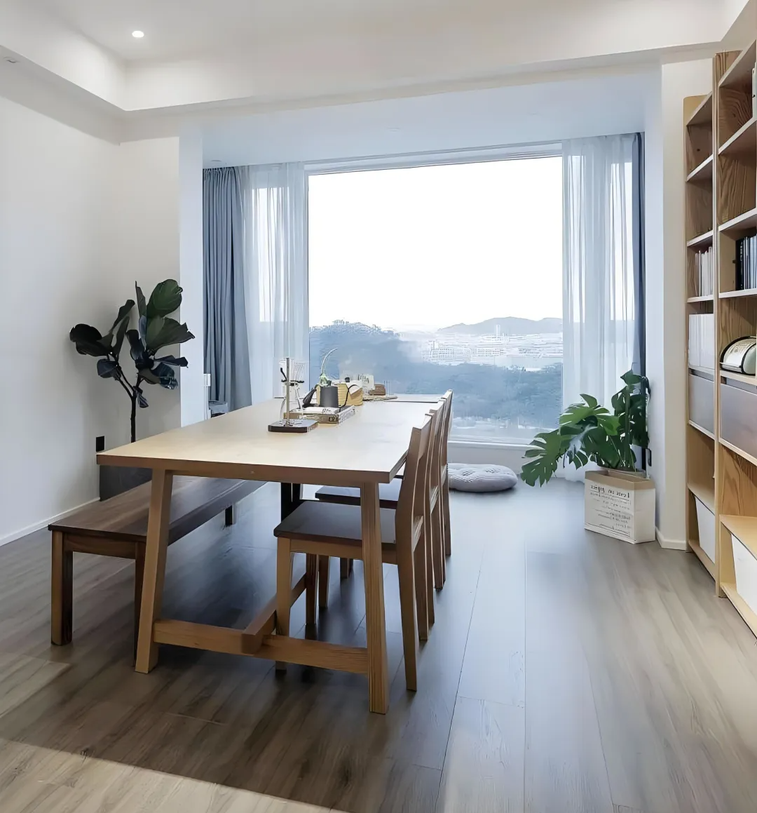 第3个我认为超棒的决定就是做了一个可折叠的工作台,家里没有书房但又要满足办公和打游戏需求,同时还要防止孩子弄坏电脑。于是就通过一面墙“偷了”一个功能区。平时将它拉下来,桌面台板合上就是一面柜墙,没有人能看出。需要用的时候打开,再搭配餐厅里的餐桌,这个地方就是工作区,实现了职住一体化设计。