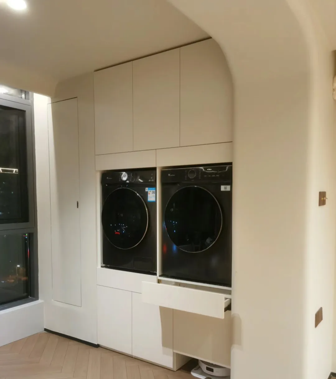 这个装修决定做得实在是太对了,对于腰不好的人来说洗衣服频繁弯腰很难受,尤其是孕妈们,老公上班去了,一个人在家洗衣服很不方便。这个时候给洗衣机做个抬高设计,离地大概70公分,这样直立就能拿取衣服。