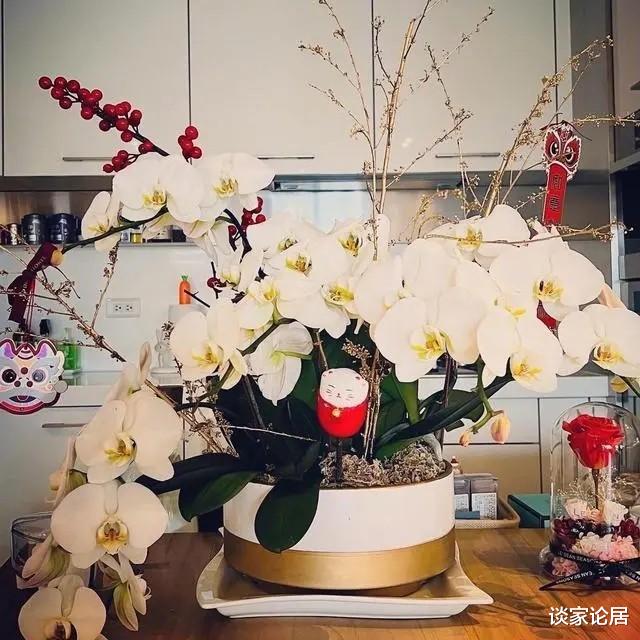 从一些摆设可以看出,王心凌是有生活情趣的人,比如上图在餐桌上的这盆白色的蝴蝶兰,配上冬青、狮头挂饰等,显得好看又喜庆。