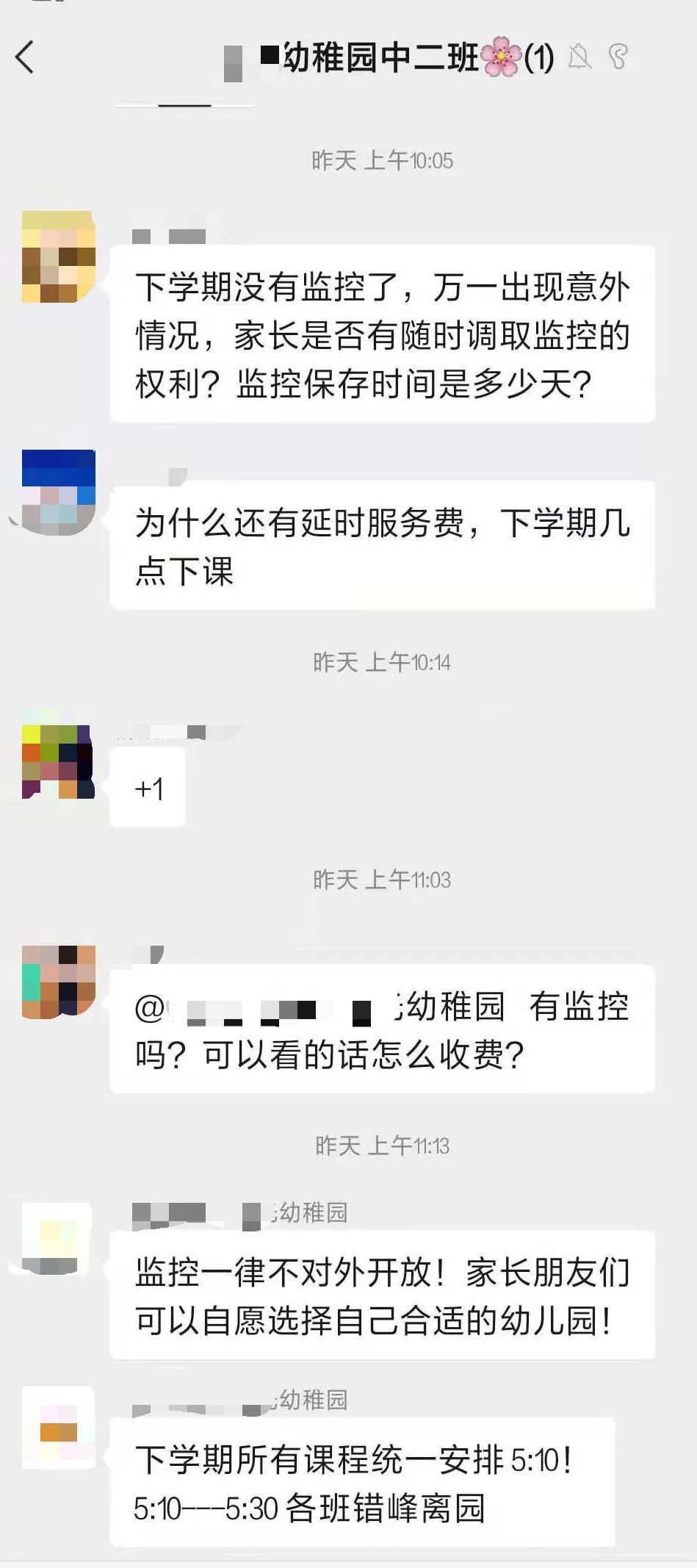 此次解散家长群,据说是因为2020年末结下了梁子。2020年,幼儿园转为普惠幼儿园,每学期收费标准是6300元左右,相比此前的9000多元降低了不少。不过幼儿园拒绝退还差额,这使得家长有意见并投诉到教育主管部门。“费用降低了,似乎服务也发生了改变,以前可以调取监控,现在不可以了。”难道调取监控视频,幼儿园增加了成本?幼儿园方面并没有解释清楚便解散了群。
