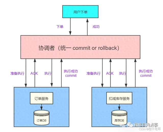 每个执行操作,都先问问这个事务协调器 ,所有人说可以,我们就执行,有人执行失败了,其他成功的全部回滚,简单好记,无脑粗暴