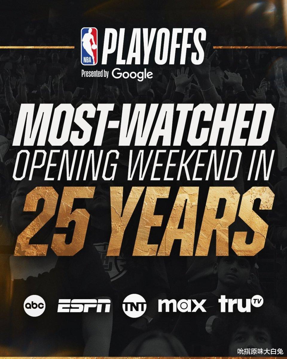 NBA季后赛创下了近25年季后赛开幕周周末的收视纪录,平均观众人数达到了440万人次,较去年增长17%。这主要得益于湖人vs森林狼,快船vs掘金,勇士vs火箭,这三组流量对决。东部估计就大城市纽约尼克斯贡献最大流量,然后凯尔特人有些流量。其他球队流量没办法和西部的比较,西部竞争太猛了,而且加州三大流量队伍收视确实猛。这也就意味着横扫的局面不太容易出现。
