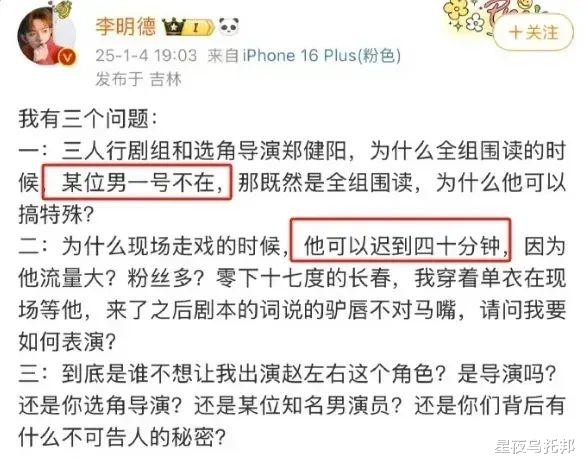 但让人没有想到的是,在2025年的1月5日,李明德在网络上发文控诉马天宇及《三人行》剧组。